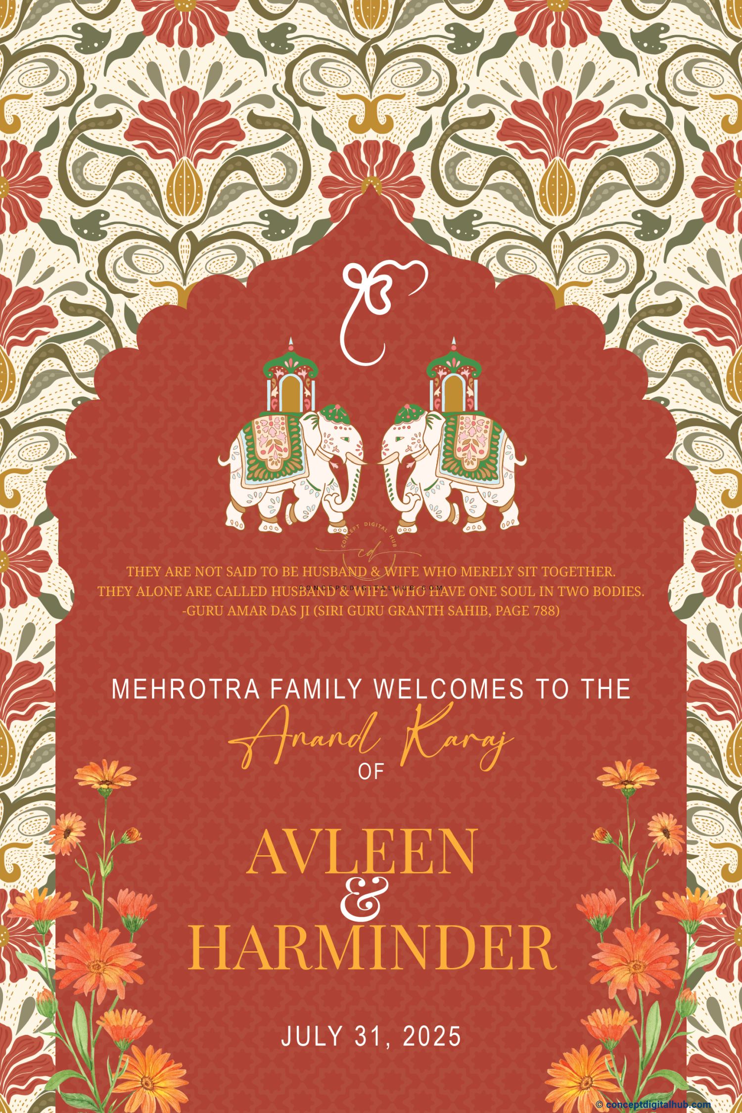The Dull Red Color Elephant Sign Welcome Board for Anand Karaj features a rich, muted red backdrop accented with a graceful elephant motif, symbolizing prosperity and good fortune. Specifically designed for Anand Karaj ceremonies, this welcome board offers a dignified and culturally significant entrance for guests. Its sturdy construction ensures it remains a prominent and elegant focal point throughout the celebration, enhancing the sacred and joyous atmosphere of your special event.