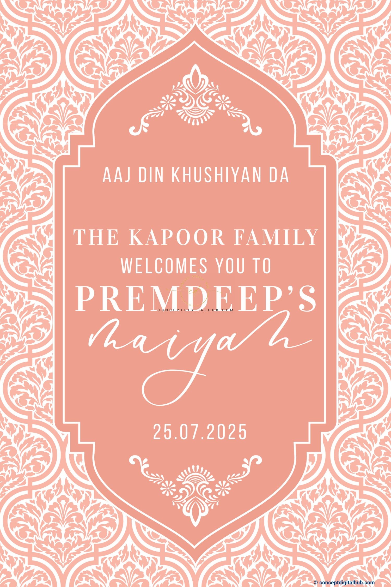 The Peachy Pink Color Damask Welcome Board for Maiyan features a soft peach-pink background adorned with intricate damask patterns, creating an elegant and inviting entrance for your Maiyan celebration. Its refined design adds a touch of traditional charm while maintaining a contemporary appeal. Crafted for durability, this welcome board ensures a lasting impression, warmly greeting guests and enhancing the festive atmosphere of your special event.