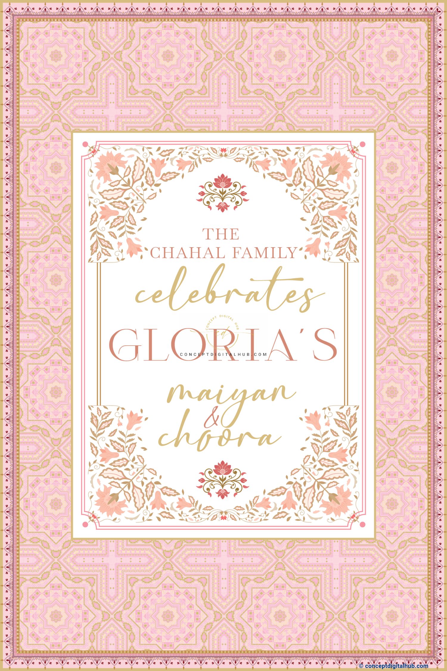 Enhance your Choora ceremony with the Pink Color Floral Welcome Board, designed to combine delicate floral patterns with a soft pink palette. This expertly crafted welcome board creates a charming and graceful entry point, setting an elegant ambiance that honors tradition while elevating the decor. Perfect for adding a refined, welcoming touch to your special occasion.